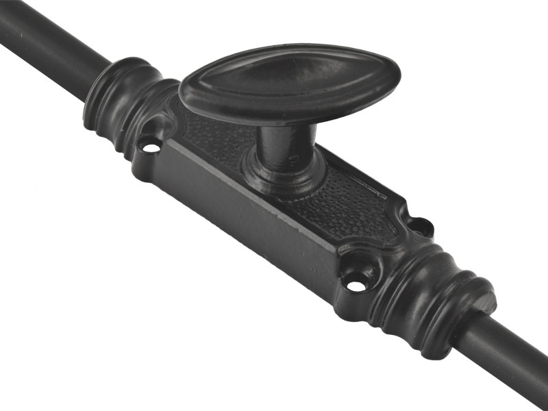 Ikkunan valurautainen pitkäsalpa ovaalilla kädensijalla.