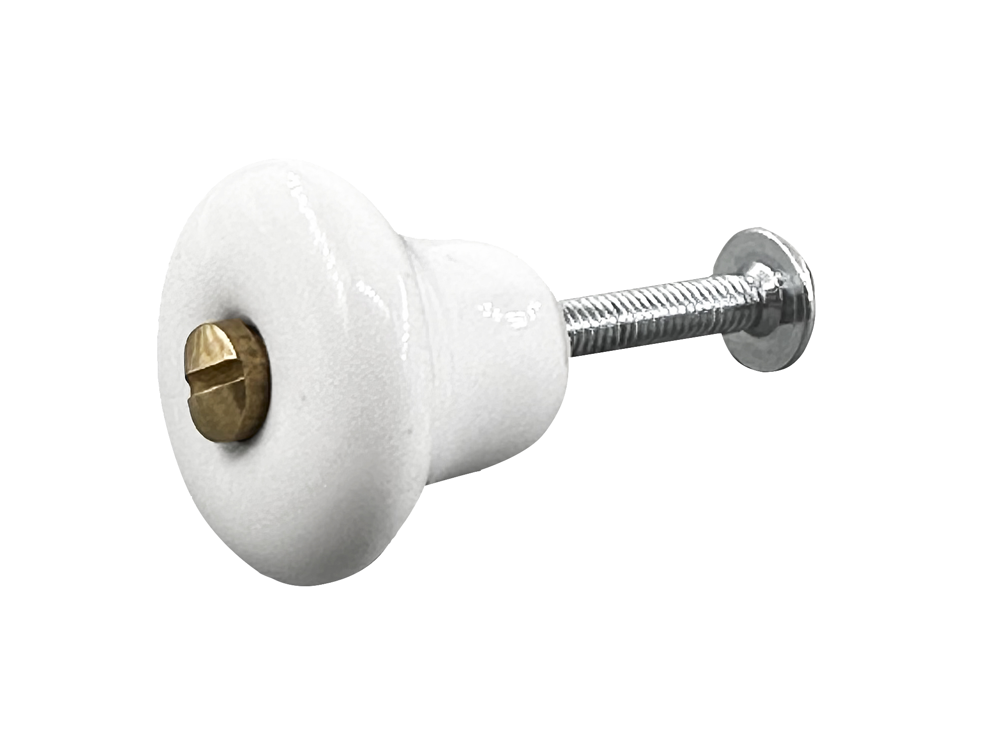 Nuppi valkoista posliinia ja ruuvi messinkiä.