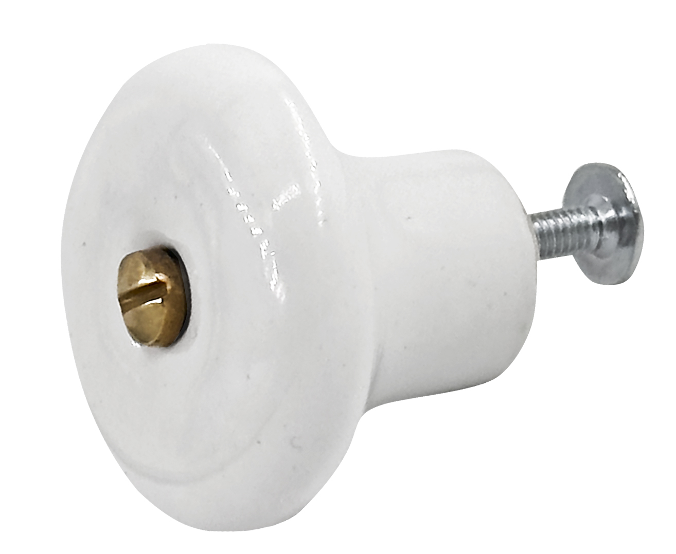 Nuppi valkoista posliinia ja ruuvi messinkiä.