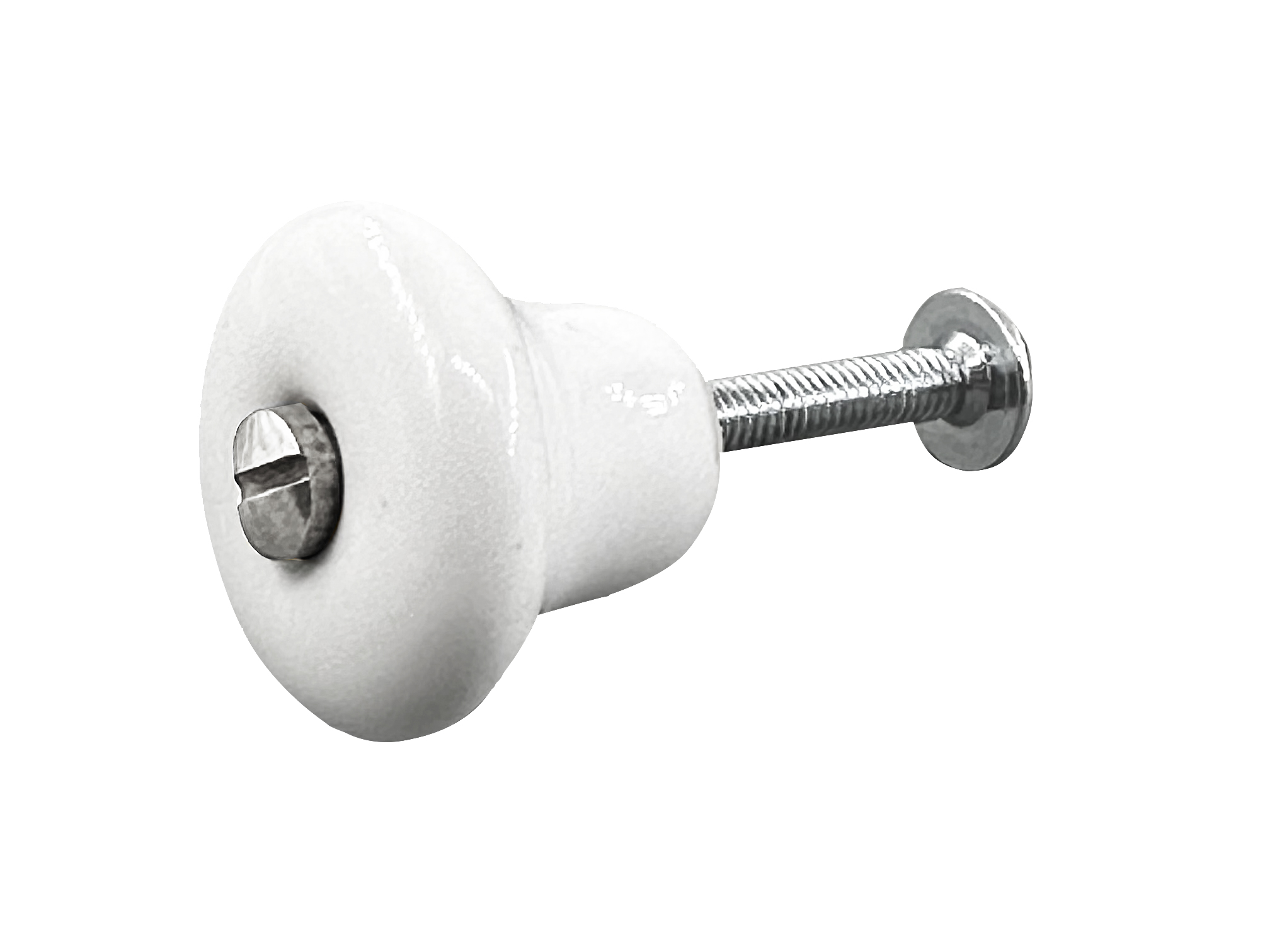 Nuppi valkoista posliinia ja ruuvi niklattu.