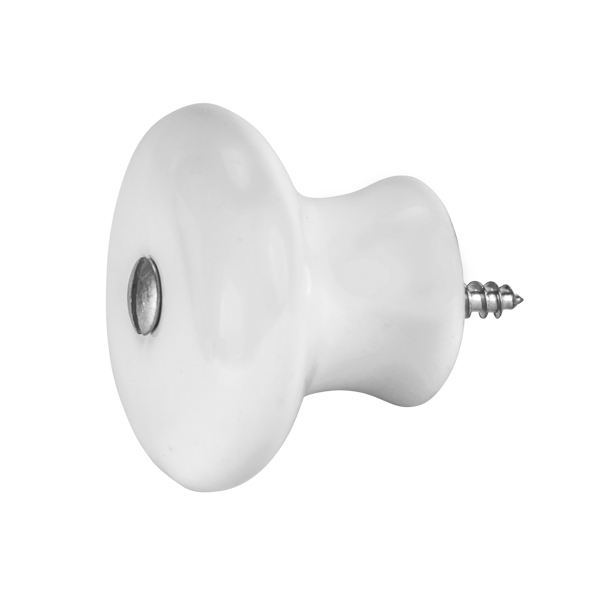 Nuppi valkoista posliinia ja ruuvi niklattu.