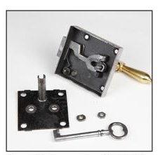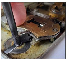 1900-luvun jälkipuolen lukko, jossa avain on melko pieni. Lehden sekä siinä olevien hampaiden on siirrettävä haittalevyt oikeaan asentoon ennen kuin lukitustelki liikkuu.