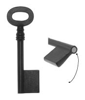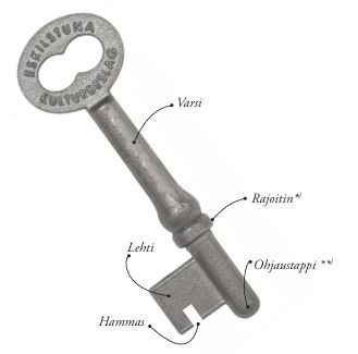 *) Kun avaimen voi työntää lukkoon molemmilta puolilta, avain voi solahtaa lukon läpi eli liian syvälle. Pieni paksunnos varressa estää tämän ja lehti pysähtyy oikeaan kohtaan.