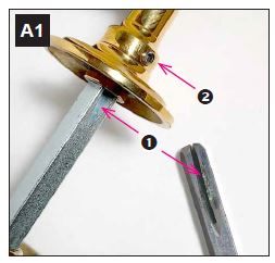 Painike kiinnitetään karatappiin (1) kuusiokoloruuvilla (2). Ruuvin on osuttava karan uraan.
