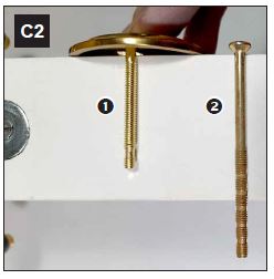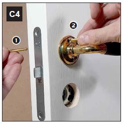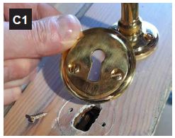 Vanhan lukon painike- ja avainkilpi kiinnitetään oven kummallekin puolelle erikseen lyhyillä pinta-asennusruuveilla (C1). Nykyaikaisissa lukoissa vastakkaiset peitelevyt yhdistetään oven läpi asennettavilla ruuveilla ja muttereilla (C2–C4). Molemmat ruuvierät ovat mukana painikepakkauksessa.