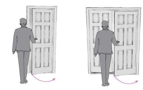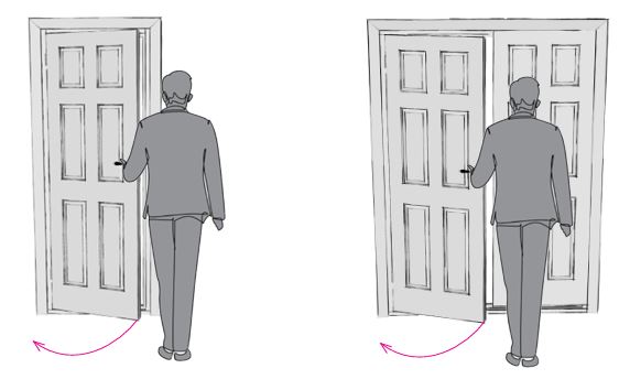 Kun avaat oven itseesi päin, se sujuu luontevasti vasemmalla kädellä. Saranat ovat vasemmalla ja painike oikealla.