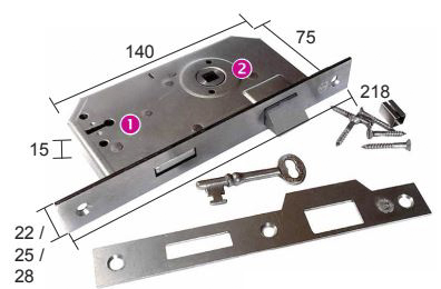 Pieni lukkorunko (1), jonka kätisyys voidaan vaihtaa. Edessä irrallinen peitelevy (2). Avaimen ja painikekahvan reiät eivät yleensä osu kohdalleen alkuperäisen lukon mukaisten ovessa olevien reikien kanssa. Myös karmissa oleva vastarauta täytyy vaihtaa tai siinä olevaa aukkoa työstää.