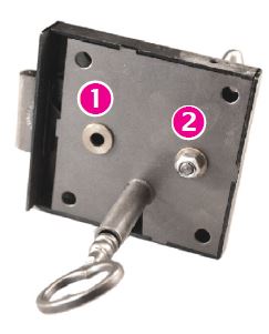 Tämän lukon taustalevyssä on peilikuvalliset kiinnitysaukot (1 ja 2), joten levyn voi kääntää. Avaimenreikä siirtyy toiselle puolelle, ja kätisyys vaihtuu.