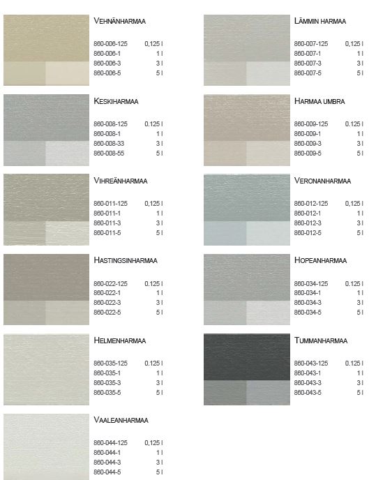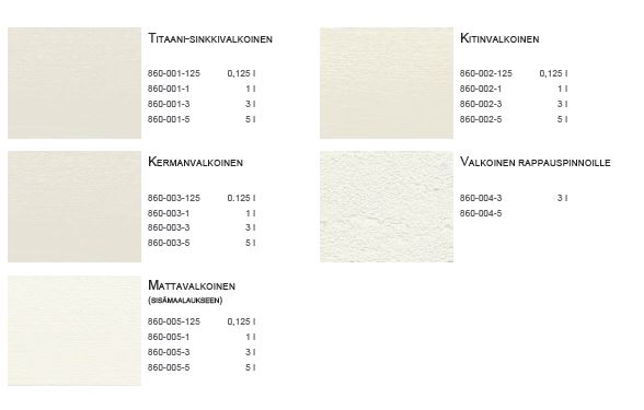 Valkoiset ovat kysytyimpiä sävyjämme. Perusvalkoinen sävymme Titaani-sinkkivalkoinen on myös osana useimmissa valmiista sävyistämme. Valkoiset sävyt ovat hieman läpikuultavampia kuin muut sävyt. Titaani-sinkkivalkoista lisäämällä saa valmissävyistä myös helposti sekoitettua vaaleampia sävyjä itsekin. Kaikki valkoiset ja vaaleanharmaat sävyt sisältävät titaanidioksidia ja sinkkioksidia. Pigmentit täydentävät hyvin toisiaan: titaanidioksidilla on hyvä peitto-ominaisuus ja sinkkioksidi antaa maalille kovuutta ja kiiltoa.