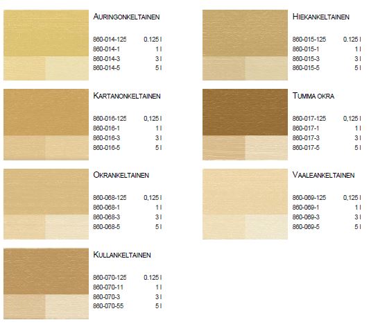 Keltaisissa sävyissämme käytämme seuraavia pigmenttejä: erilaisia keltaisia okria, rautaoksidikeltaista, nikkeli-titaani-