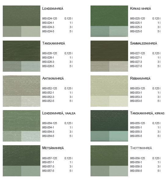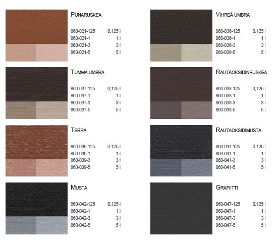 Valikoimissamme oleva ruotsalainen Ottosson Färgmakerin valmistama pellavaöljymaali on sävytetty valmiiksi. Sävymalleissa yllä oleva sävy on maalin valmis sävy. Alla vasemmalla on 1/2 valmissävyä ja 1/2 osa Titaani-sinkkivalkoista ja oikealla alhaalla 1/4 valmissävyä ja 3/4 Titaani-sinkkivalkoista. (Valkoisten sävyjen mallit ovat kokonaan valmissävyä.)