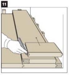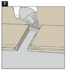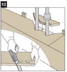 7. Lankkujen päätypontit liimataan puuliimalla ja painetaan paikoilleen sorkkaraudan tai kiilojen avulla. Ylimääräinen liima on pyyhittävä pois välittömästi kostealla liinalla. Pitkiä sivuja ei saa liimata!