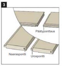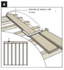 11. Viimeinen seinän viereen tuleva lankku on useimmiten katkaistava pituussuunnassa. Aseta muokattava lankku suoraan viimeistä edellisen lankun päälle ja piirrä sahausviiva seinää pitkin kulkevaa apulankkua apuna käyttäen lankun pintaan. Näin seinän mahdolliset epätarkkuudet tulee otettua huomioon. Viimeisestä lankusta pontin alareunaa voi joutua ottamaan pois hieman, jotta lankun saa paikoilleen. Seinän viereiset lankut kannattaa ruuvata päältä.
