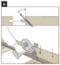 12. Jos lankun läpi tulee esim. putkituksia lämmityspattereille, mittaa putkien paikat ja tee lankkuihin 10 mm putkea suuremmat reiät sekä sahaa pala pois viistossa kulmassa reikää kohden. Asenna lankku paikoilleen ja liimaa sitten sahattu kappale omalle paikalleen.