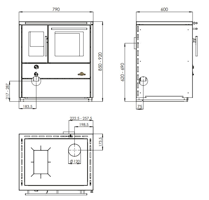 Heimdall 790 -puuhella, hormiliitäntä takana oikealla.