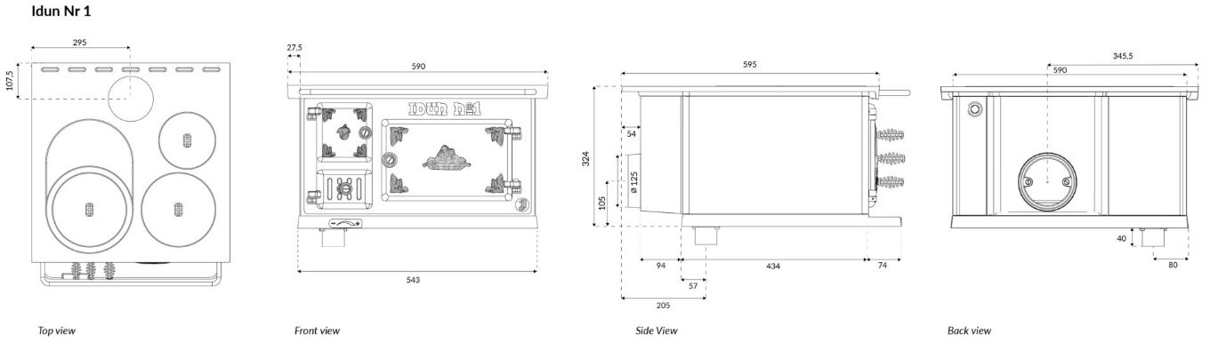 Hellan leveys on 59 cm, syvyys 59,5 cm ja korkeus 32,4 cm (ks. mittakuva). Hormiliitoksen halkaisija on 125 mm.