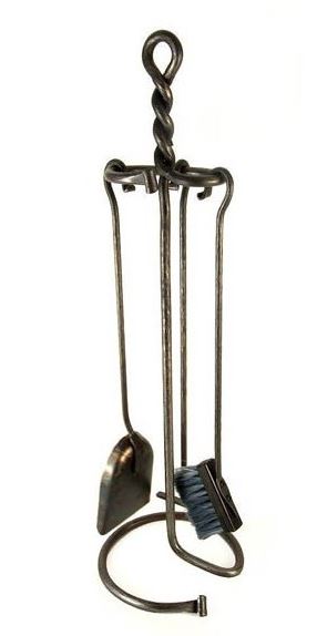 Omalla jalallaan seisovassa telineessä on kaikki takan tai tulisijan hoitoon tarvittavat välineet; hiilihanko, -lapio ja -harja.