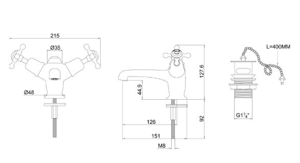Claremont -kaksiotehanassa on posliiniset nuppien päät. Allastulppa on ketjullinen.