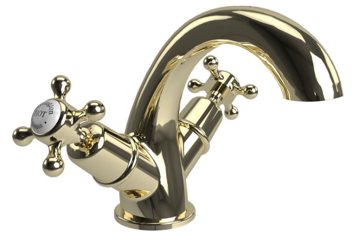 Messinki, pinnoitettu kullanväriseksi. Nupeissa on posliiniset päät.
