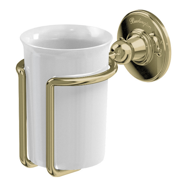 Muki posliini, valkoinen. Teline messinkiä, pinnoitettu kullanväriseksi.