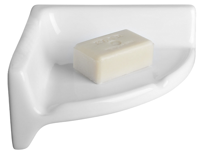 Posliininen kulmahylly sopii myös palasaippualle. Ylimäääräinen vesi ei jää hyllylle seisomaan reunassa olevien kolojen johdosta.