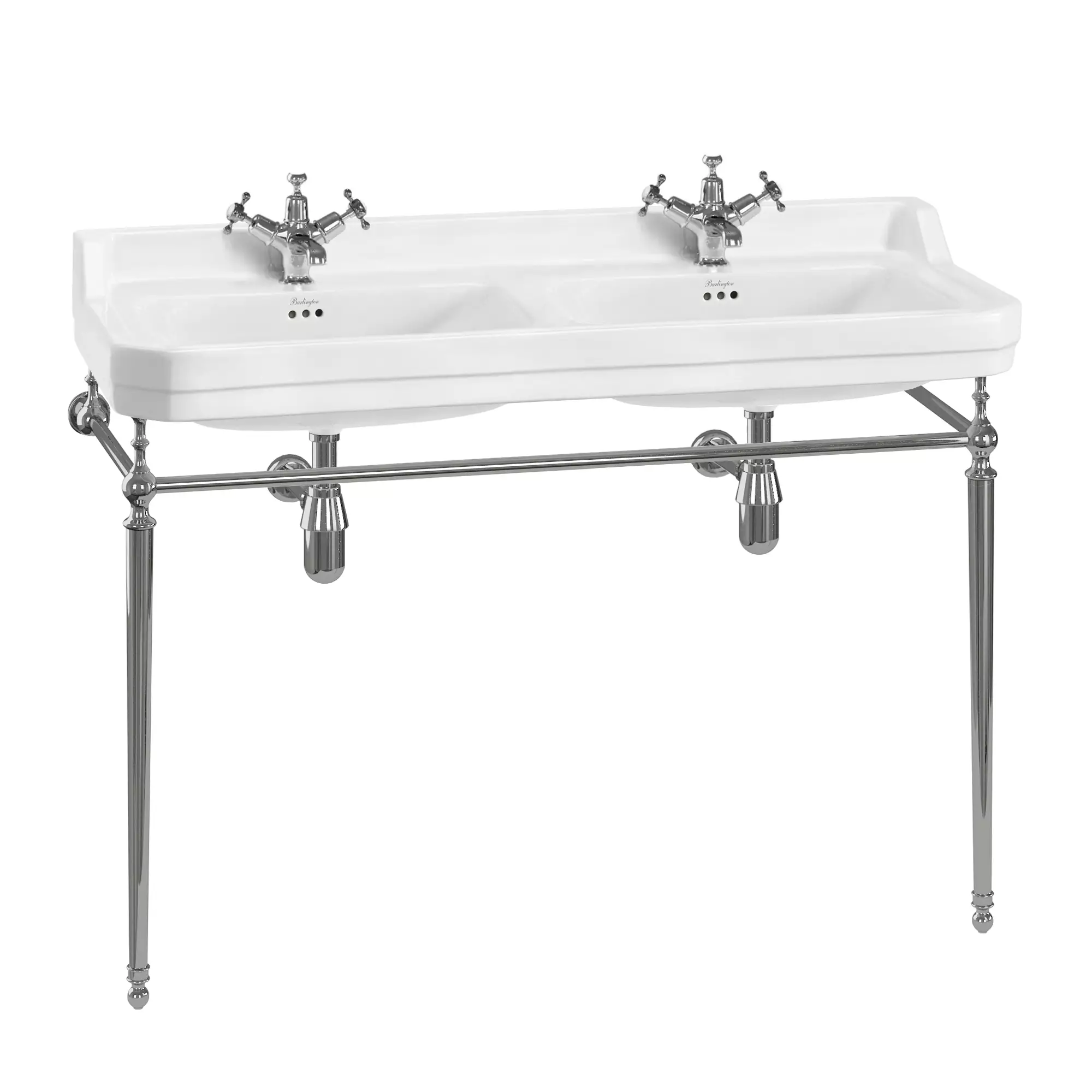 Tuote Edwardian-sarjan tupla-allas on peräti 120 cm leveä. Kahden altaan ansiosta kylpyhuoneessa on tilaa useammalle perheenjäsenelle laittautua yhdessä. Hananreikiä on tässä allasmallissa mahdollista valita 1 tai 3.