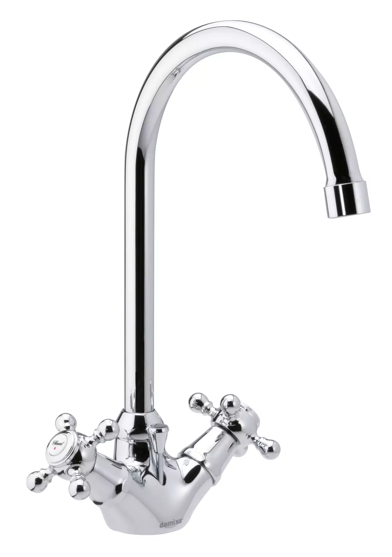 Vanhaan kylpyhuoneeseen hyvin sopivassa hanassa on omat säätimet kylmälle ja kuumalle vedelle. Altaaseen asennettavaa vipupohjaventtiiliä säädetään nupista juoksuvesipylvään edessä.