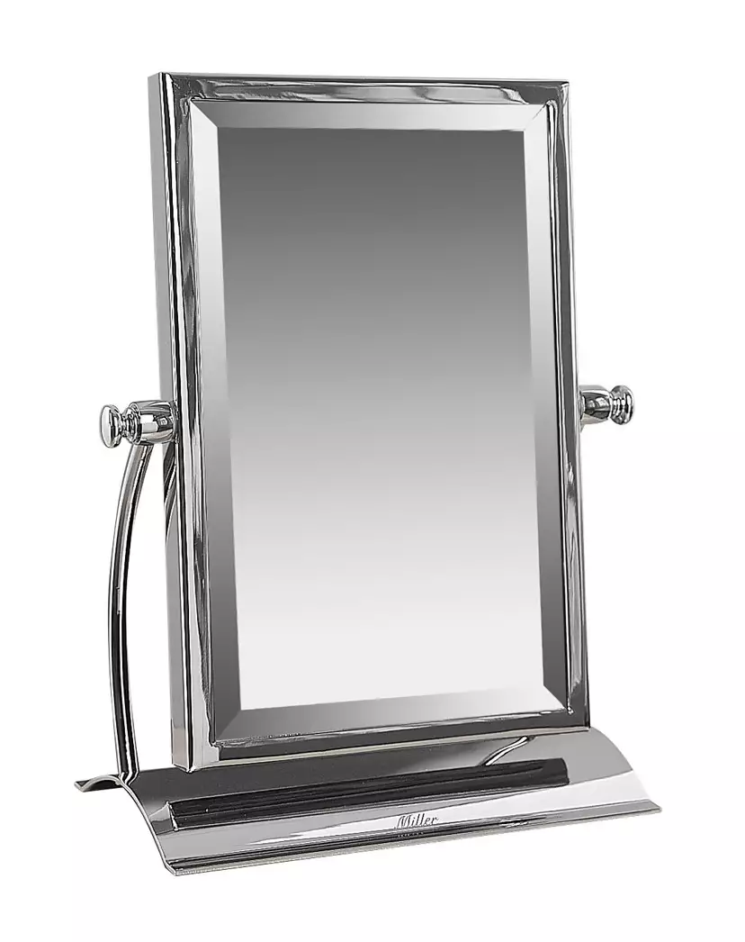 Pöydällä omalla jalallaan seisova peili on käännettävissä ympäri sivuilla olevien kannakkeiden ansiosta. Toisella puolella oleva peili on suurentava.