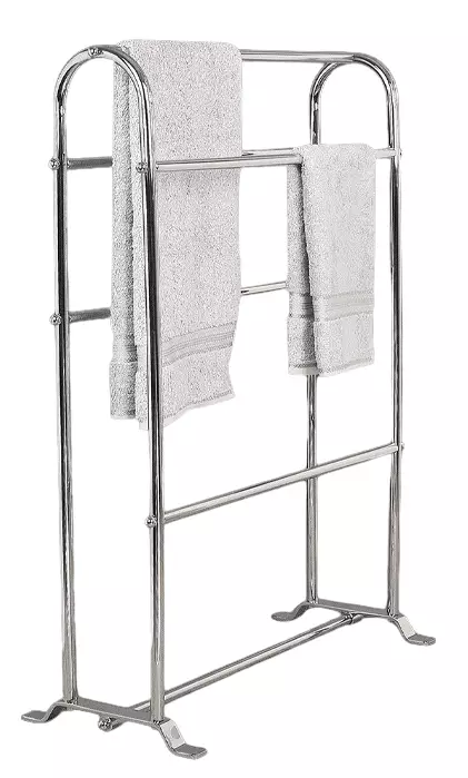 Omilla jaloillaan seisova pyyhkeiden kuivausteline on näyttävä kaluste tilavassa kylpyhuoneessa.