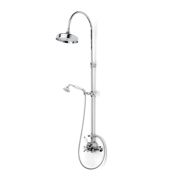 Tässä suihkuhanassa on sekä kiinteä yläsuihku että käsisuihku ja termostaatti veden lämpöä säätelemässä.