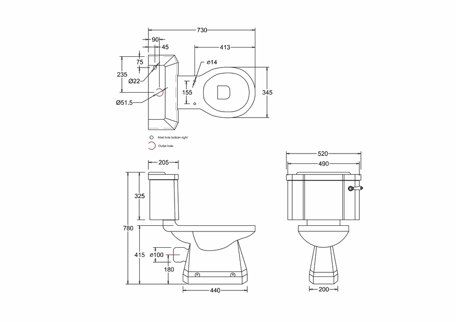 Mitat Säiliön leveys 44 cm, istuimen korkeus 84,5 cm ja syvyys 73 cm. Istumakorkeus ilman kantta on 48 cm. Samasta WC-istuinmallista on valittavissa myös matalampi vaihtoehto, jonka istumakorkeus on 41,5 cm.