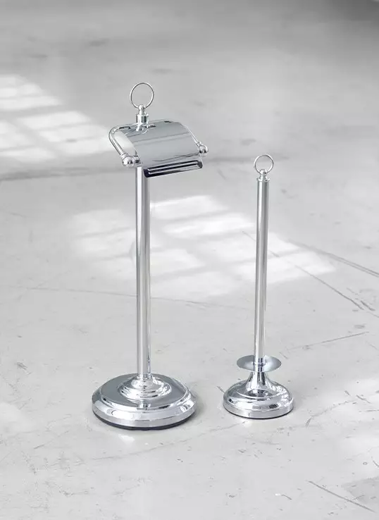 Jämäkkää tekoa oleva teline Wc-paperitullille ei helposti keikahda. Telineeseen mahtuu kolme rullaa.