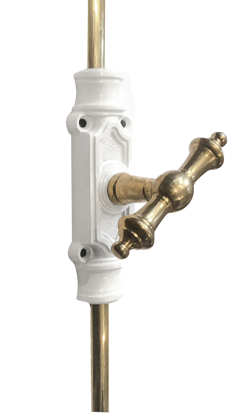 Materiaali Kädensija on kiillotettua messinkiä. Pohjalevy ja pääty- sekä läpimenokappaleet ovat valkoiseksi maalattua valurautaa ja tanko lakkaamatonta messinkiä.