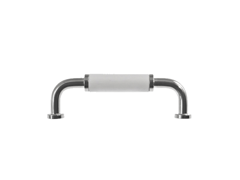 Messinki, niklattu. Käsiote on valkoiseksi maalattua puuta.