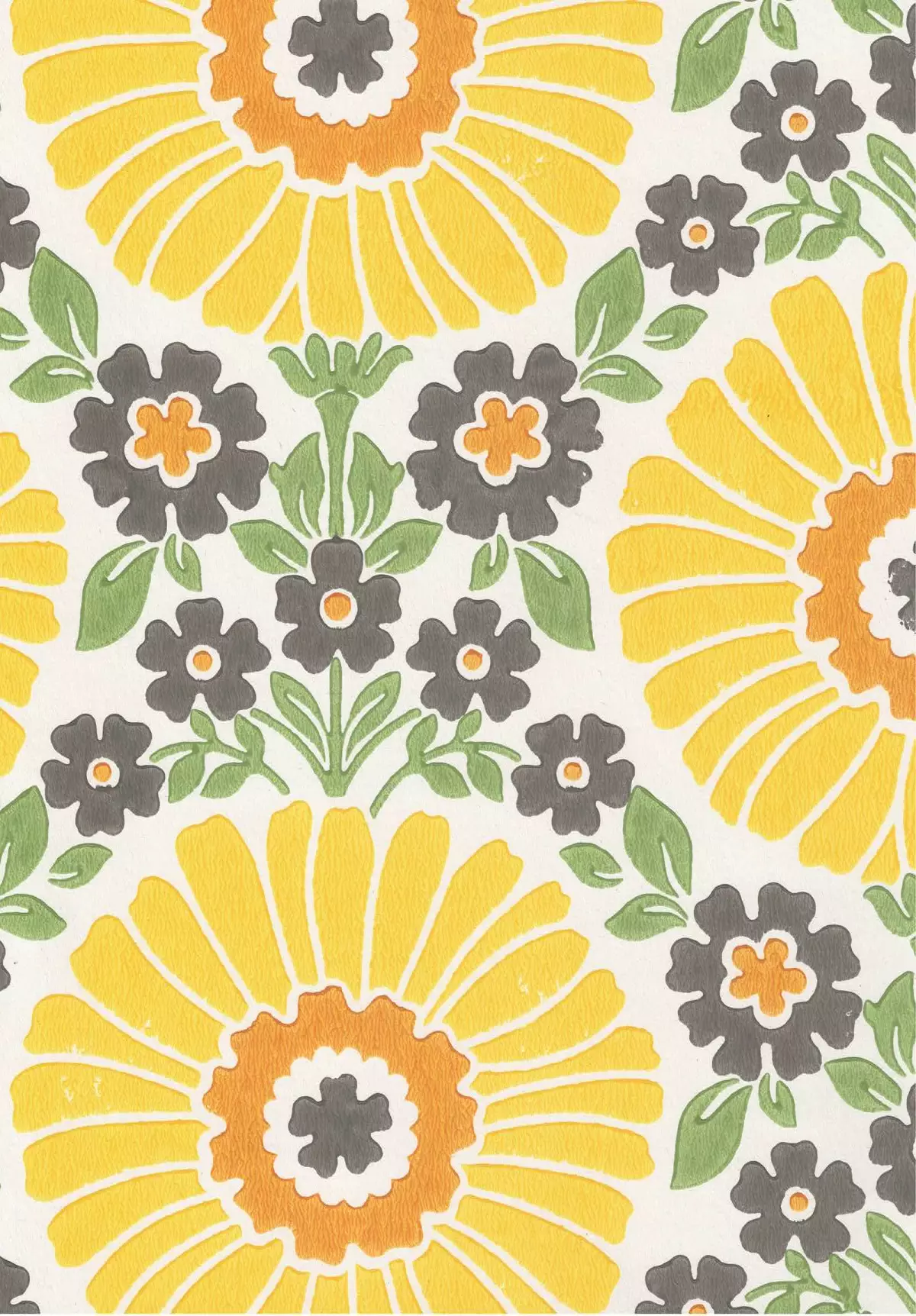 Värikäs 1970-luvun tyylinen tapetti, joka tuo tilaan kesäistä lämpöä ja eloa.