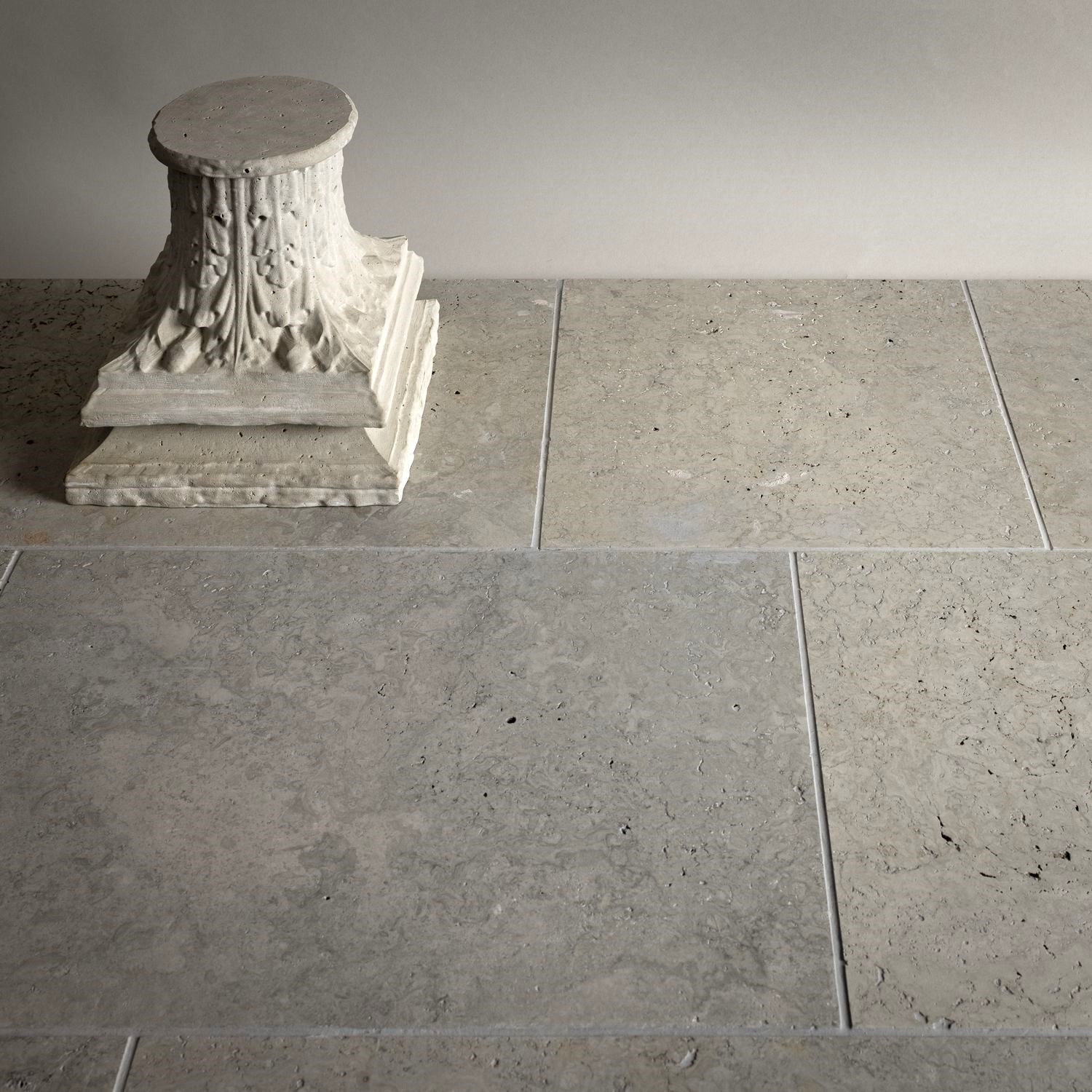 Materiaali Dolomiitti, pinta hiottu. Sävymaailma on vaalean- tai sinertävänharmaa, mutta harmaan sävyt vaihtelevat. Laattoja ei lajitella värin tai kuvion mukaan, vaan tavoitteena on eläväinen lattiapinta. Dolomiittikivelle ominaista on kiven pinnassa näkyvät huokoset, joista suurimmat on täytetty. Laattoja on mahdollista tilata myös ilman korjauksia - ilmoittakaa siitä ystävällisesti erikseen tilausta tehdessänne.