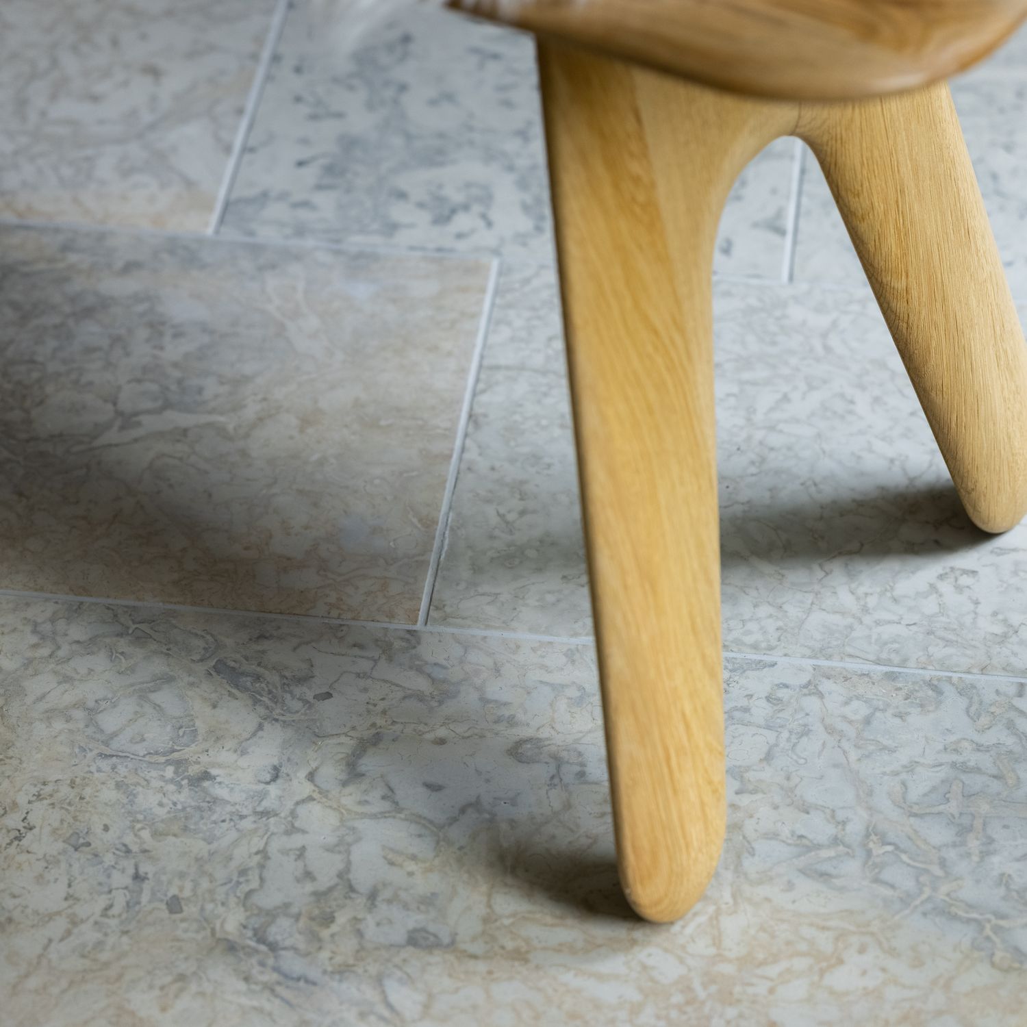 Materiaali Dolomiitti, pinta hiottu. Sävymaailma on kellertävän ja sinertävän kuvioinen, mutta sävyt ja kuviot vaihtelevat. Laatta on voimakaskuvioinen. Laattoja ei lajitella värin tai kuvion mukaan, vaan tavoitteena on eläväinen lattiapinta.