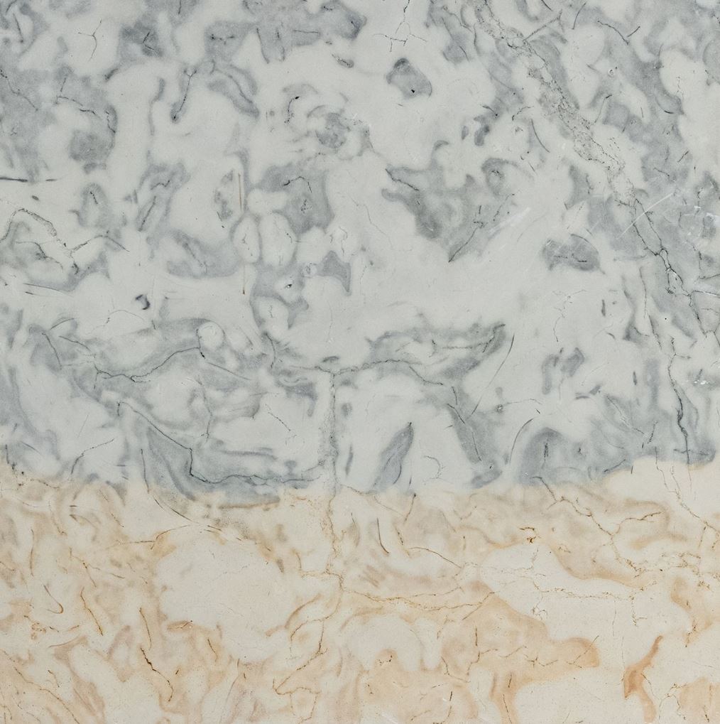 Dolomiitti, pinta hiottu. Sävymaailma on kellertävän ja sinertävän kuvioinen, mutta sävyt ja kuviot vaihtelevat. Laatta on voimakaskuvioinen.