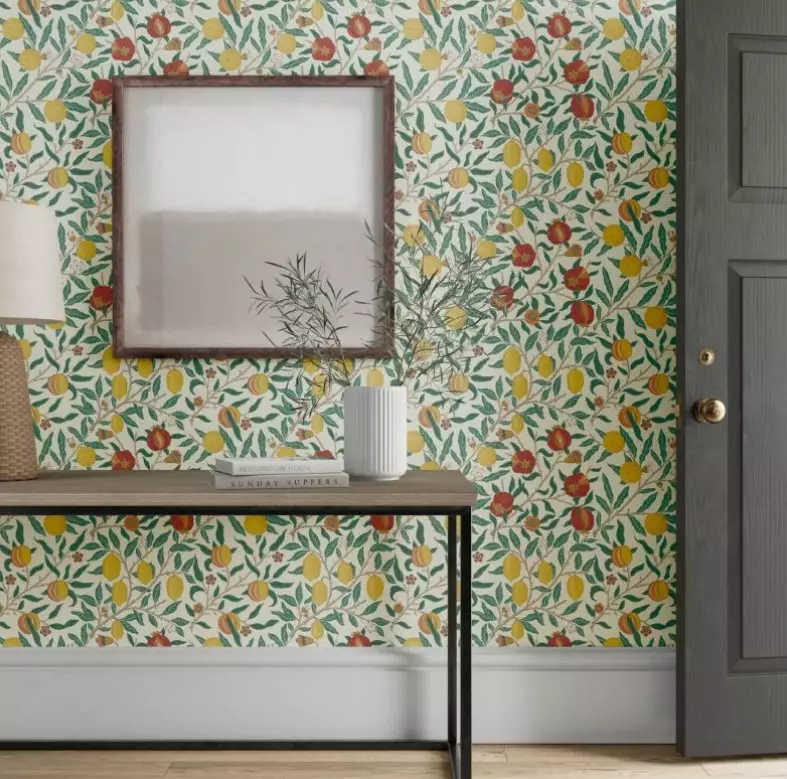 Granaattiomenoita ja sitruunoita! Tämä William Morrisin kuosi sopii hyvin mm. keittiön tapetiksi.