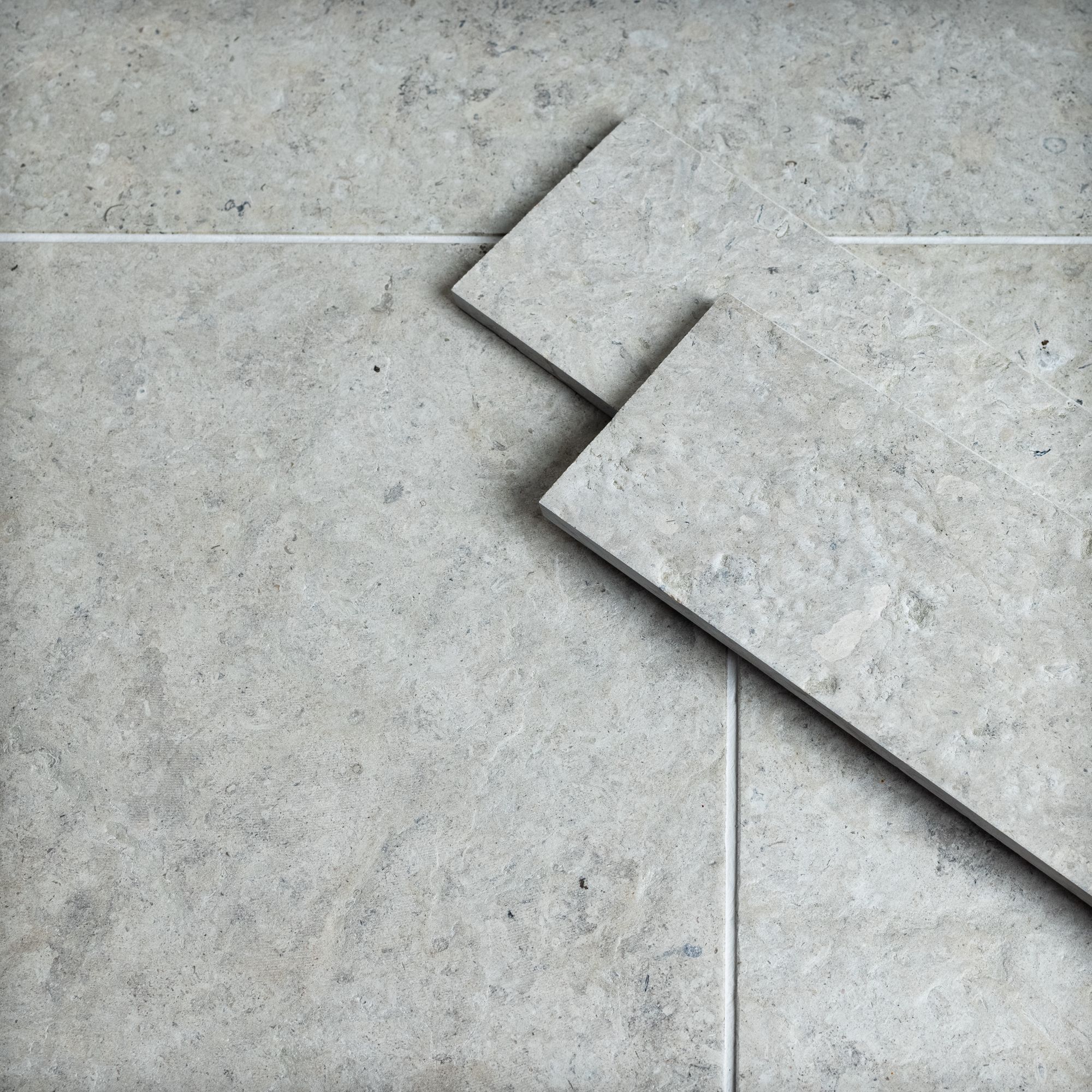 Kalkkikivi, pinta harjattu. Sävymaailma on harmaa, mutta harmaan sävyt vaihtelevat. Laattoja ei lajitella värin tai kuvion mukaan, vaan tavoitteena on eläväinen lattiapinta.