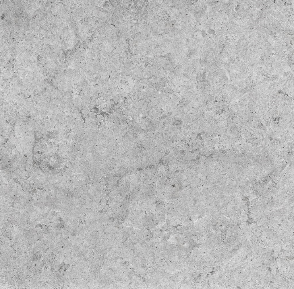 Kalkkikivi, pinta harjattu. Sävymaailma on harmaa, mutta harmaan sävyt vaihtelevat. Laattoja ei lajitella värin tai kuvion mukaan, vaan tavoitteena on eläväinen lattiapinta.