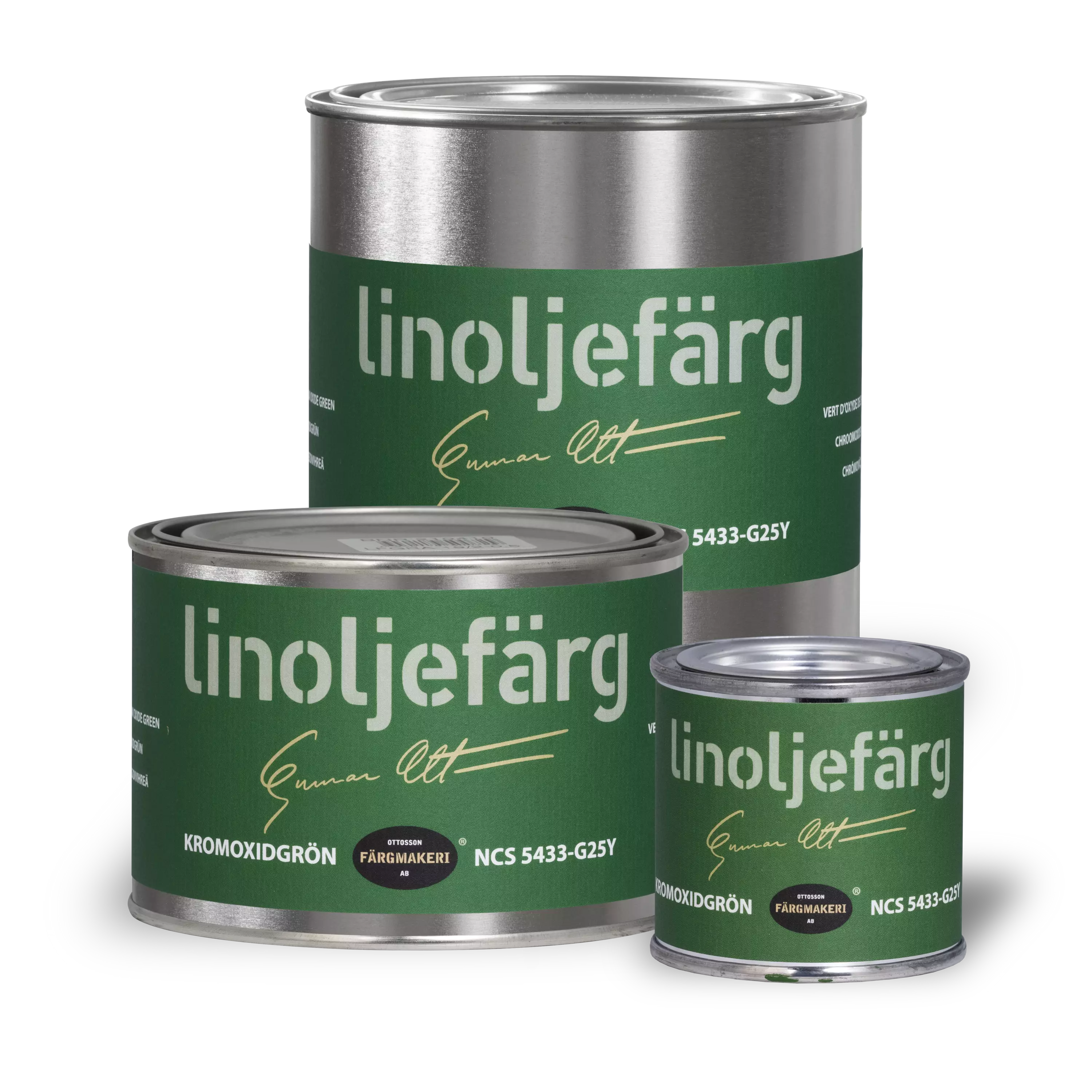 Kirkas vihreä/ NCS-värikoodi 5433-G25Y. Ottossonin oma värinimike on Kromoxidgrön. Ylin kuvan värisävyistä on ns. standardisävy. Oikealla alhaalla oleva sävy on sekoitettu perussävystä (1/4) ja titaani-sinkkivalkoisesta (3/4). Vasemmalla alhaalla on perussävyä (1/2) ja titaani-sinkkivalkoista (1/2). Titaani-sinkkivalkoinen maali on ns. perusvalkoinen maali (ks. oheistuotteet).