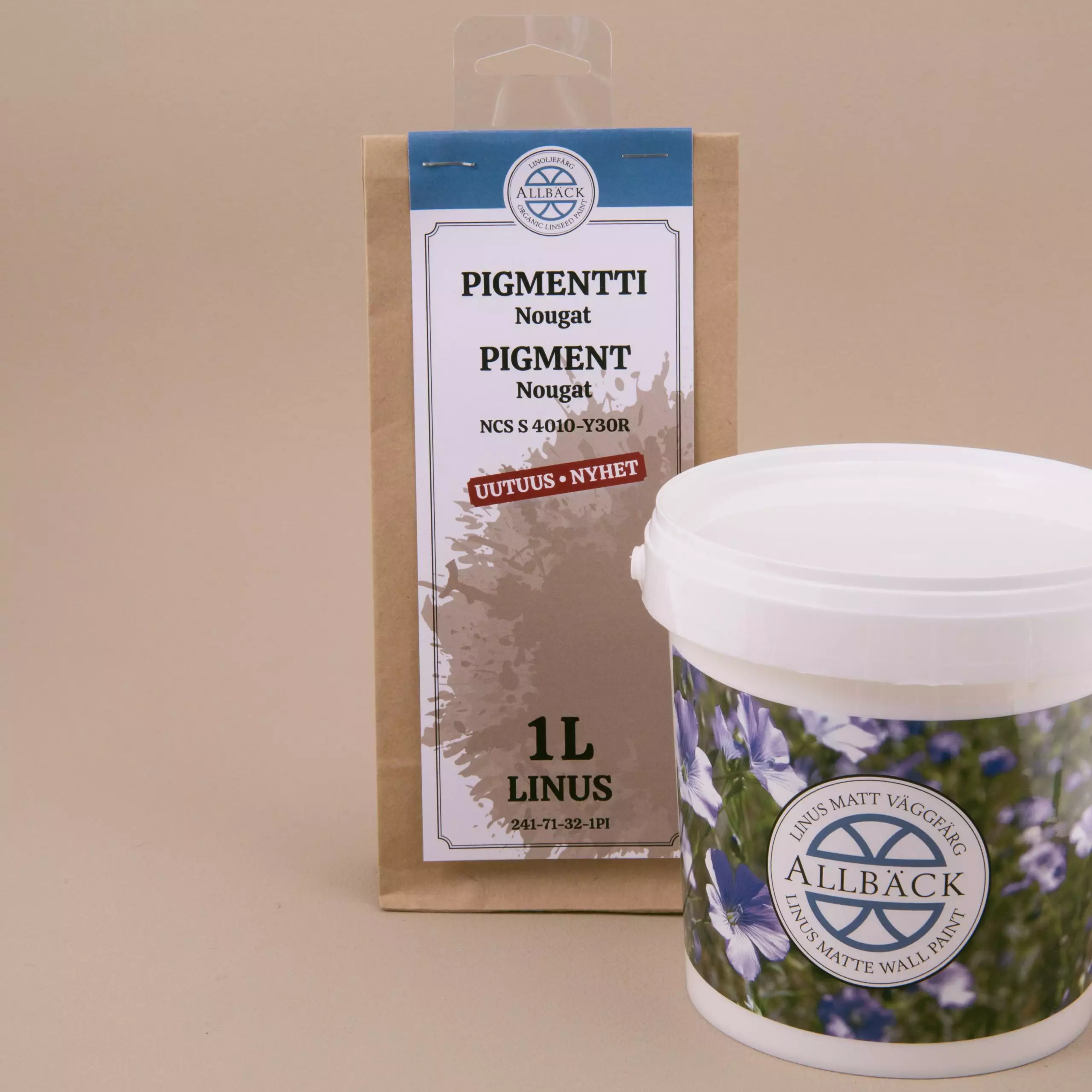 Tuoteseloste Linus -emulsiomaali sisältää pellavaöljyä, vettä, titaanidioksidia, liitua, sellakkaa, selluloosaliimaa, ja mangaanisikkatiivia.