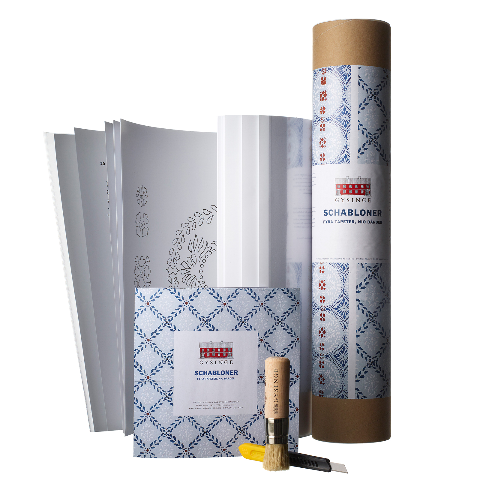 Tapettisabluunat, 4 kpl ja boordisabluunat, 9 kpl, muovikalvoja, veitsi ja tuputuspensseli.