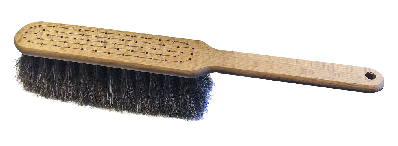 Harjas on hevosenjouhia, kädensija öljyttyä pyökkiä.