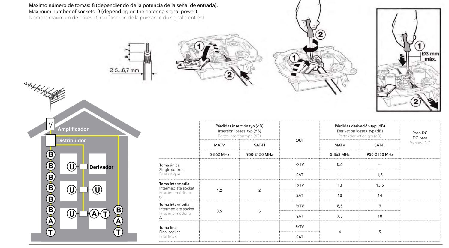 Tekniset tiedot RTV/SAT. Rasiasta on saatavilla myös ketjutettavia ja päättyvä versio (ks. oheinen kaavio). Rasia on CE-merkitty. Käytä sähkökalusteen kuoren asennuksessa ainoastaan käsityökaluja.