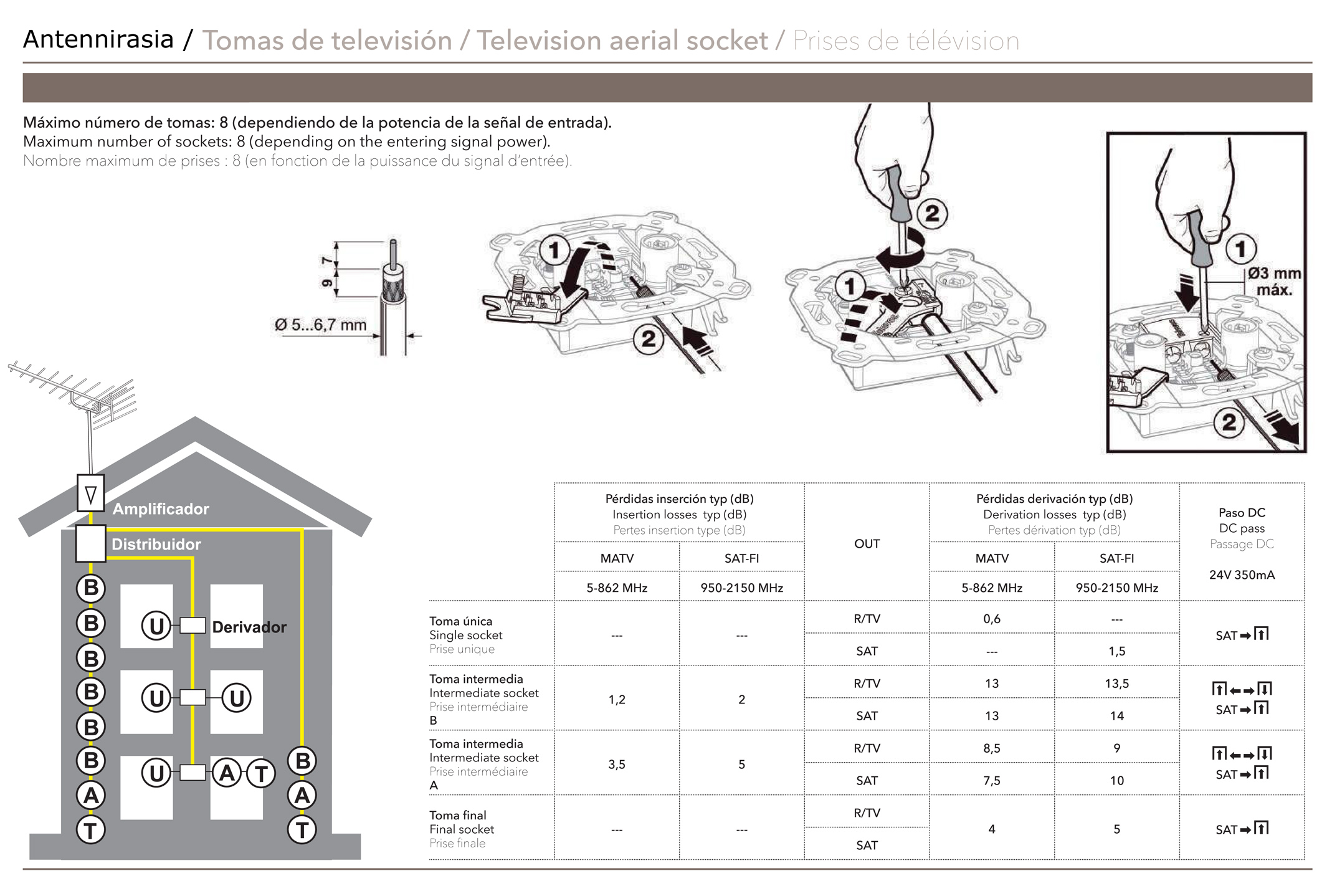 Tekniset tiedot RTV/SAT. Rasia asennetaan normaaliin kojerasiaan (CEE60). Rasiasta on saatavilla myös ketjutettavia ja päättyvä versio (ks. oheinen kaavio). Rasia on CE-merkitty. Käytä sähkökalusteen kuoren asennuksessa ainoastaan käsityökaluja.
