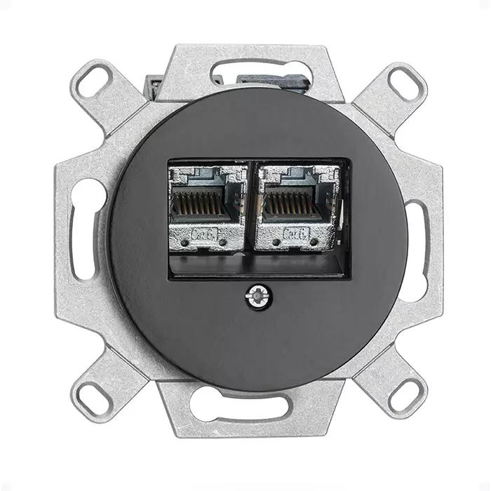 Tekniset tiedot Datarasia kahdelle liitännälle RJ45 ( real.Cat.6a ). Liittimet tulevat rasian mukana. Soveltuu 10 gigabitin Ethernet-verkkoihin (lähetyskaistanleveys jopa 500 MHz). Rasia on CE-hyväksytty (VDE). Käytä sähkökalusteen kuoren asennuksessa ainoastaan käsityökaluja.