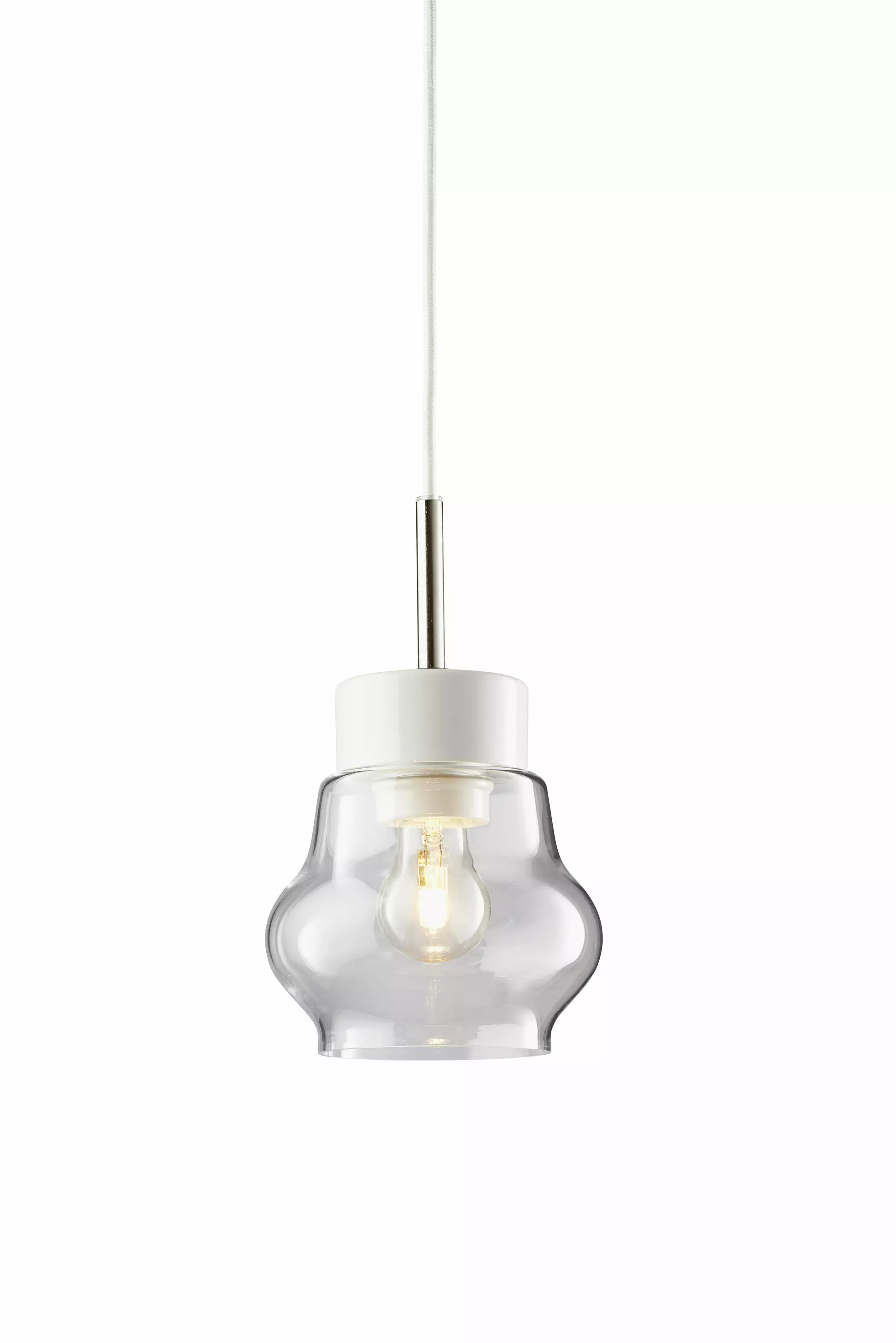 Kattovalaisin kirkaalla lasikuvulla, posliinisella kannalla ja valkoisella kangasjohdolla. Sisältää lampun pistokkeen.