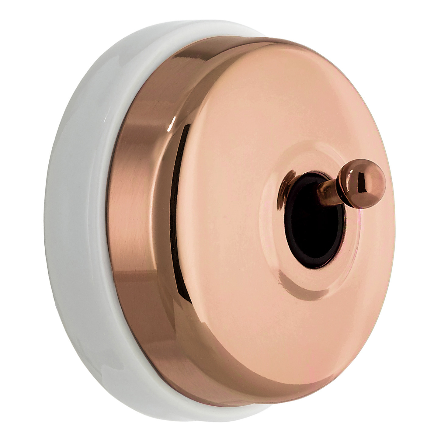 Seinän pintaan asennettava valkoinen posliininen impulssikytkin metallikuorella.